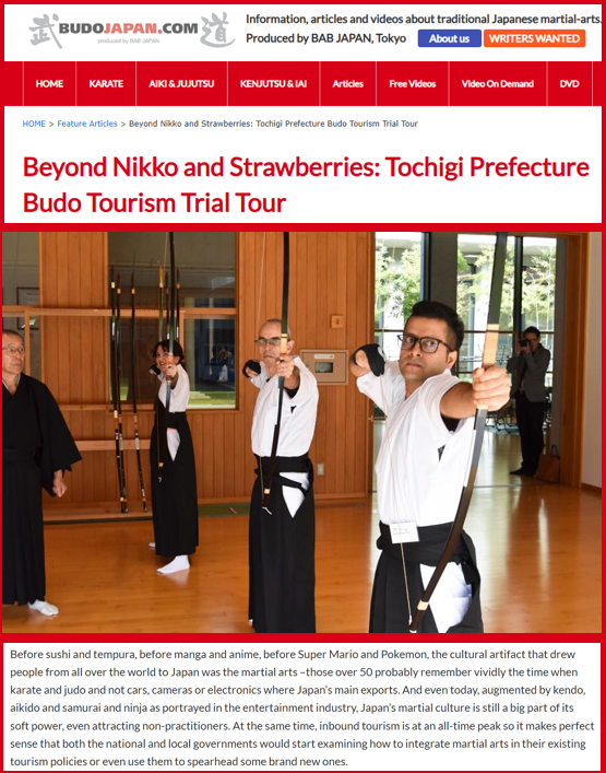 受託JLAA会員社:クロスボーダー株式会社(東京都 正会員) - 栃木県内の武道に関する競技力、高い普及状況、豊富な施設や歴史的・文化的資源を生かし、武道を「学ぶ」ことを通じて、外国の方に日本の歴史や文化などを知っていただく機会を提供する武道ツーリズムを確立することを目的として、栃木県弓道連盟の協力を得て在日外国人によるモニターツアーを実施。栃木県で弓道体験を行うことの価値を明確にするために「武士のはじまり」と伝わる藤原秀郷に関して高名な歴史学者である小和田哲男氏のセミナーを実施した。英字メディア(BUDO JAPAN.COMとgaho JAPAN)の体験記事は外国人が多用するFacebookを使って世界中に拡散し、4.54%という高いエンゲージメント率につなげている。