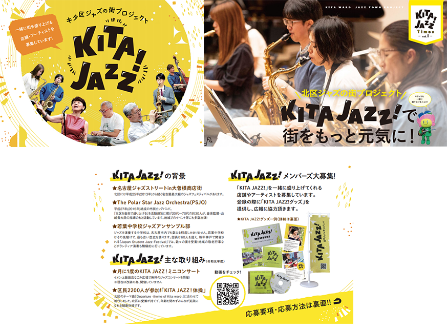 - 「名古屋市の北区=ジャズの街」のイメージを広く浸透させ、区民の地域への愛着を醸成し、まちの活性化を図るプロジェクト。「KITA JAZZ!メンバーズ」への登録店を増やすことと市民の参加を促すプロモーションが実施された。名古屋市北区で発行する情報誌「FURIMO 北区版」11 月号から 4 カ月にわたって「KITAJAZZ!」を掲載。情報誌の営業スタッフが動いたことで、日ごろから行政機関とのコンタクトがあまりない業種まで浸透させることができた。テーマ設定と地域の情報誌との連携で、地域を活性化させた好例。