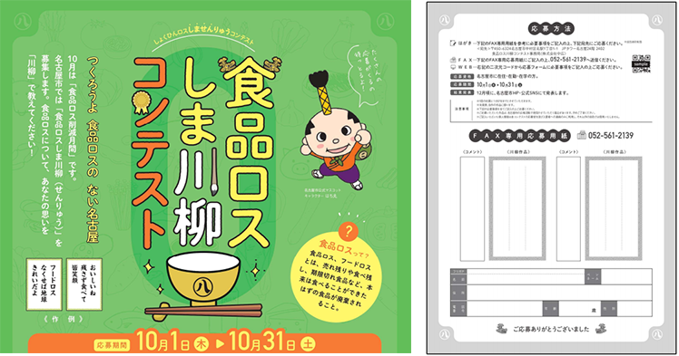 - 日本の食品廃棄物等は年間 2,531 万 t。本来食べられるのに捨てられる「食品ロス」は年間 600 万 t(2018年度推計値)。日本人 1 人当たりでは 1 年で約 47kg、毎日お茶碗一杯分のご飯を捨てていることになる。この「食品ロス」問題について、名古屋市は、大人から子どもまで楽しめる「川柳」の募集を通じて、「ご家庭ででき る食品ロス削減の取り組み」 について啓発活動を実施。「食品ロスしま川柳」というネーミングも好評で、多くの市民が参加した。今後、名古屋市の食品ロスが削減されていくことが期待できる事業。